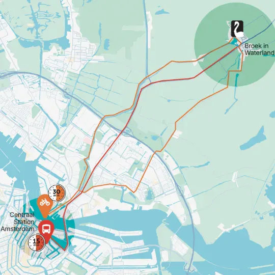 Bus 110, 112, 314, 315 of 316 vanaf Amsterdam Centraal of Station Noord brenegn je in ongeveer een kwartier reistijd naar onze voordeur. Halte Broek in Waterland, zeven minuten lopen.