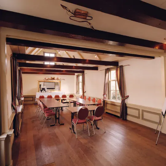 Geen lunchbuffet op warmhoudplaten en kleffe bammen kaas. Wel koffie van Boontje — naar eigen recept, en een keuken waar goed gegeten wordt. Vergaderen in monumentale stilte, in zalen met uitzicht op bomen, rust en je eigen gedachten.