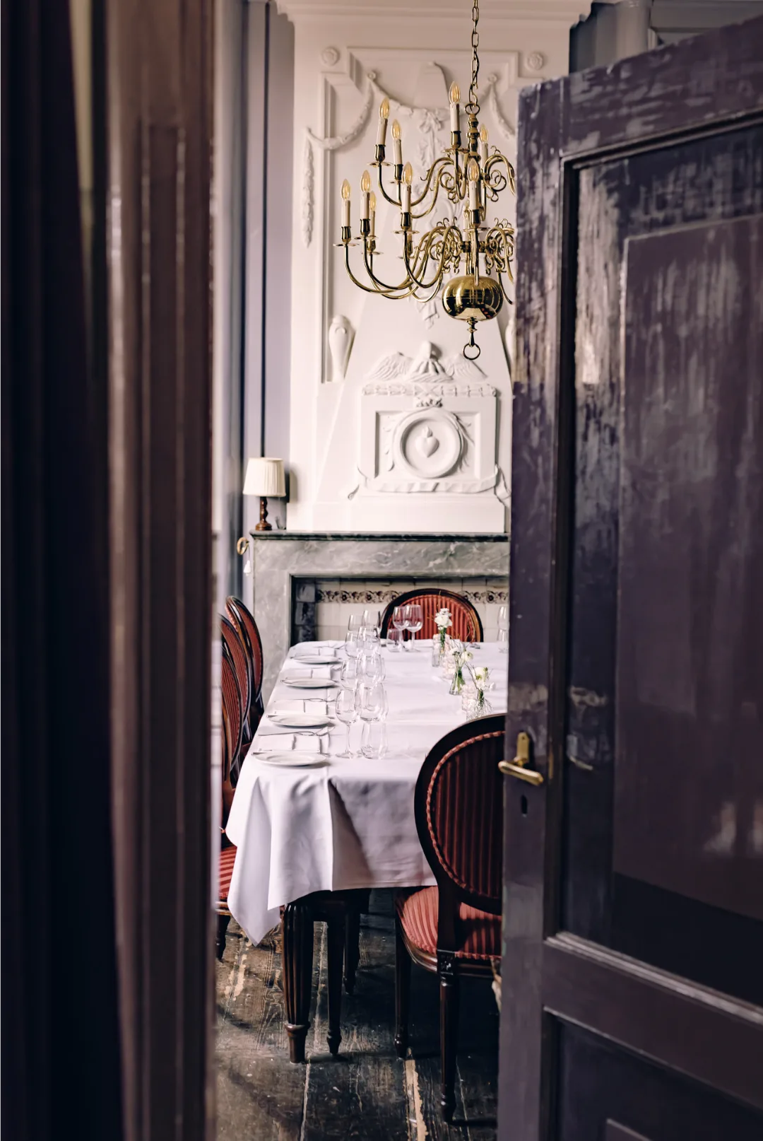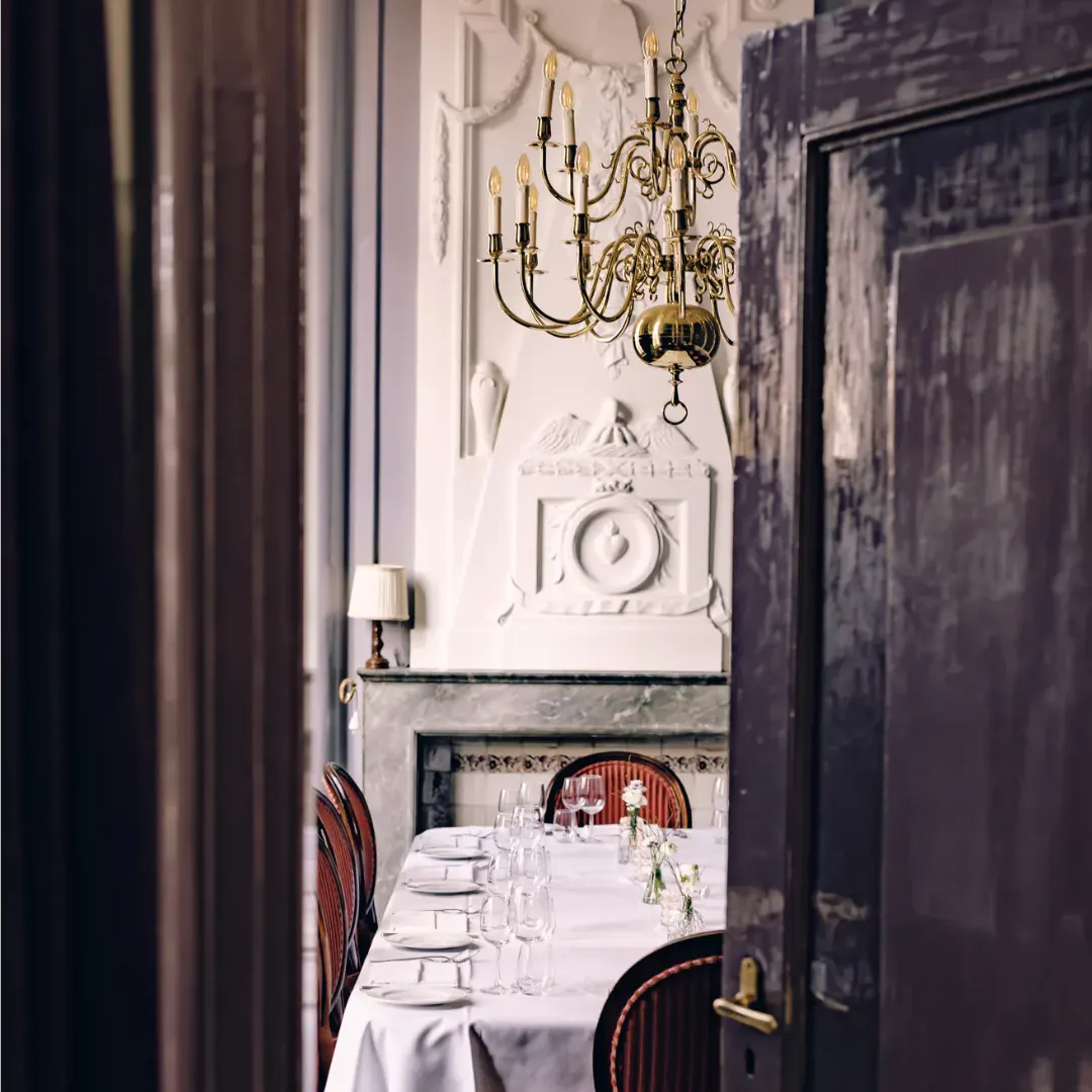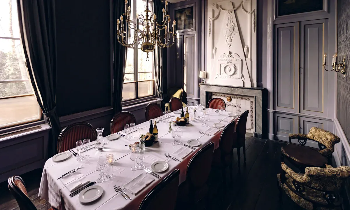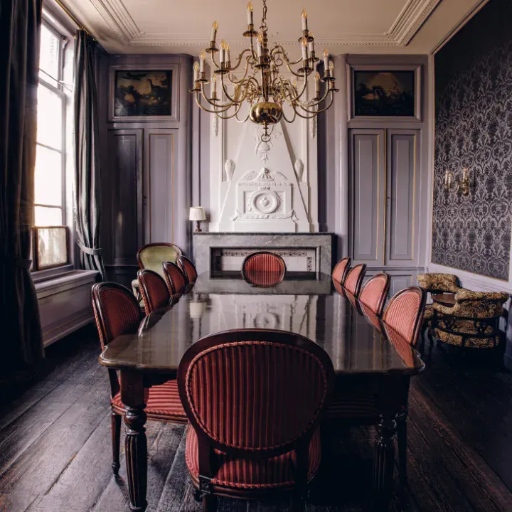 Zes directieleden rond de tafel, de deuren dicht, telefoons uit. Of twee mensen tegenover elkaar voor een gesprek dat ergens over gaat. De Regentessenkamer maakt van elke bijeenkomst iets intiems — niet door opzet, maar door het Huis zelf. Private dining met twaalf gasten bij kaarslicht, een huwelijksvoltrekking voor de kleinste kring: de kamer past zich aan.